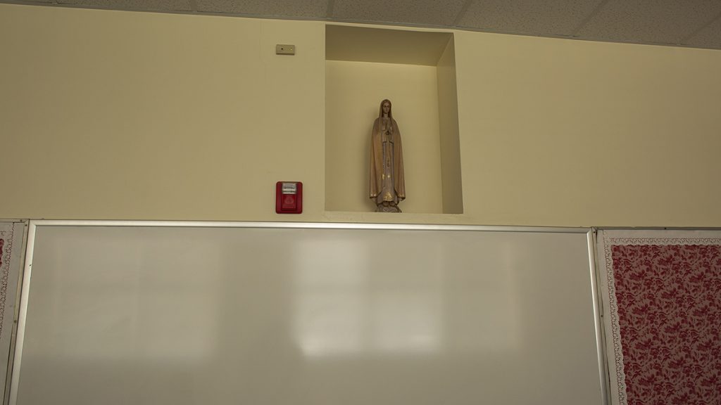 A statue of Mary looms over the students of an english classroom.