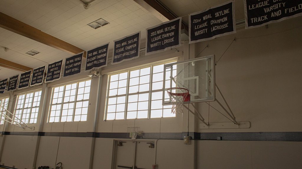 Sports award flags are hung inside Julie Billiart Hall, Notre Dame’s gymnasium.