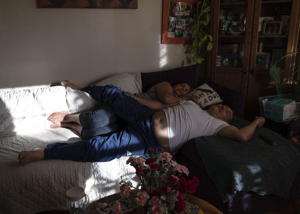 Gloria and Sergio Moreno napping after a long day of working on the backyard; gardening and painting, in the living room of their home in San Pablo, Ca. March, 2020.