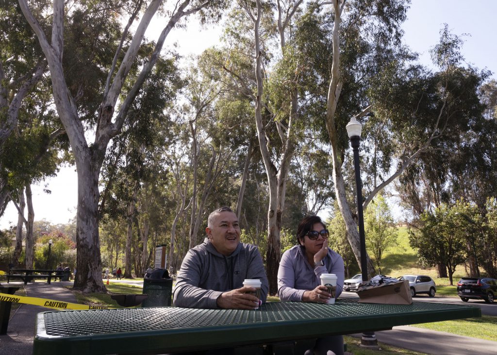 Sergio (Left) and Gloria (Right) Moreno sitting and posing under a cherry blossom tree in Refugio Valley Park, Hercules, California. Monday, March, 15th, 2021.