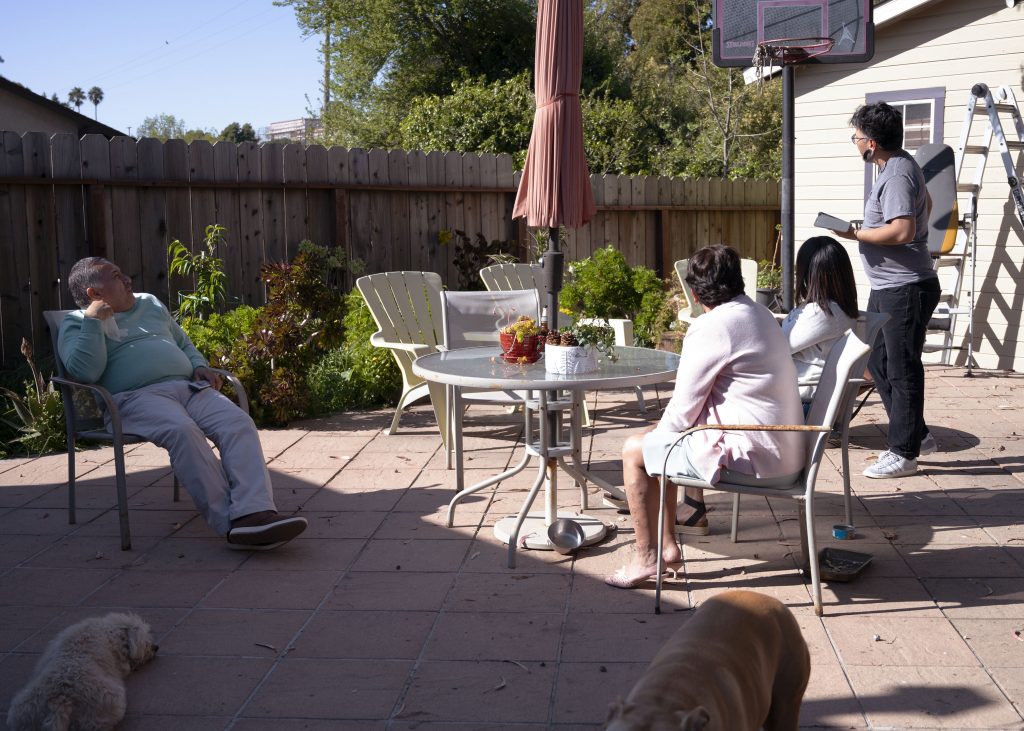 Sergio and Gloria Moreno talking about plants and trees with their son Ivan (Far right) and his wife Natalie(right) Moreno in the backyard of their home in San Pablo, Ca. Sunday, March 28th, 2021.