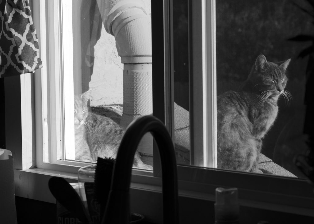 Two stray cats from the neighborhood of the Moreno residence patiently waiting for Gloria Moreno to come out with their morning plate of food in their backyard in San Pablo, Ca. Friday, March 26th, 2021.