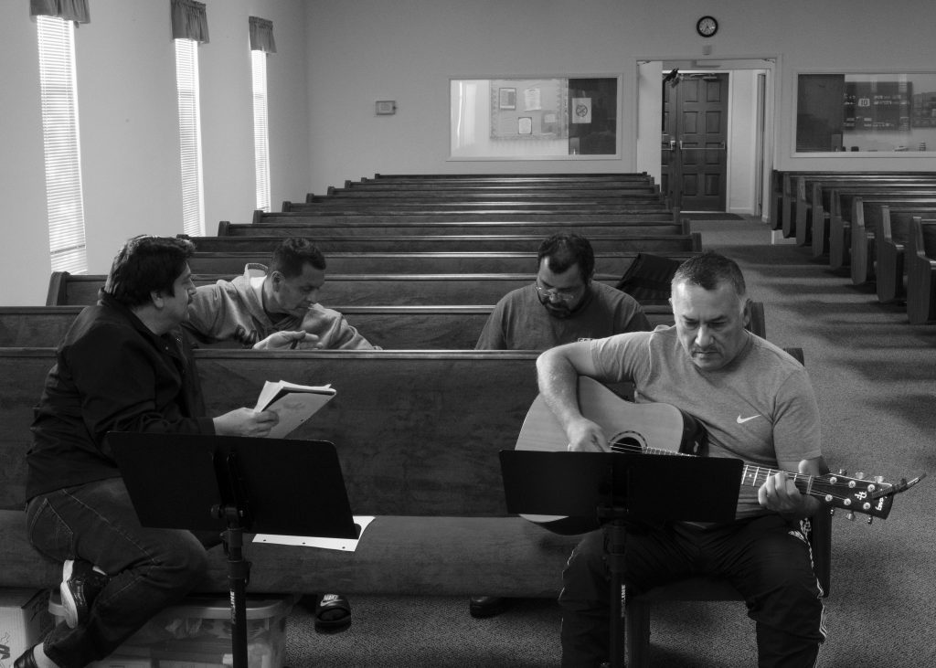 Sergio Moreno (Bottom right), Jose Hernandez (Bottom left), Arturo (Back left), and Ervin Rodriguez (Back right) prepping for their biweekly practice in Iglesia Bautista Bíblica Hispana, El Sobrante, Ca. Tuesday, April 20th, 2021.