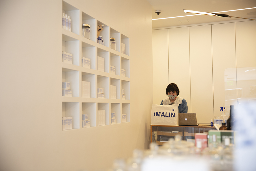 Jimin Mannick, store manager at MALIN+GOETZ, processing online orders. “Online orders and customers who support local businesses have been the reasons why the store is still surviving during the pandemic.”