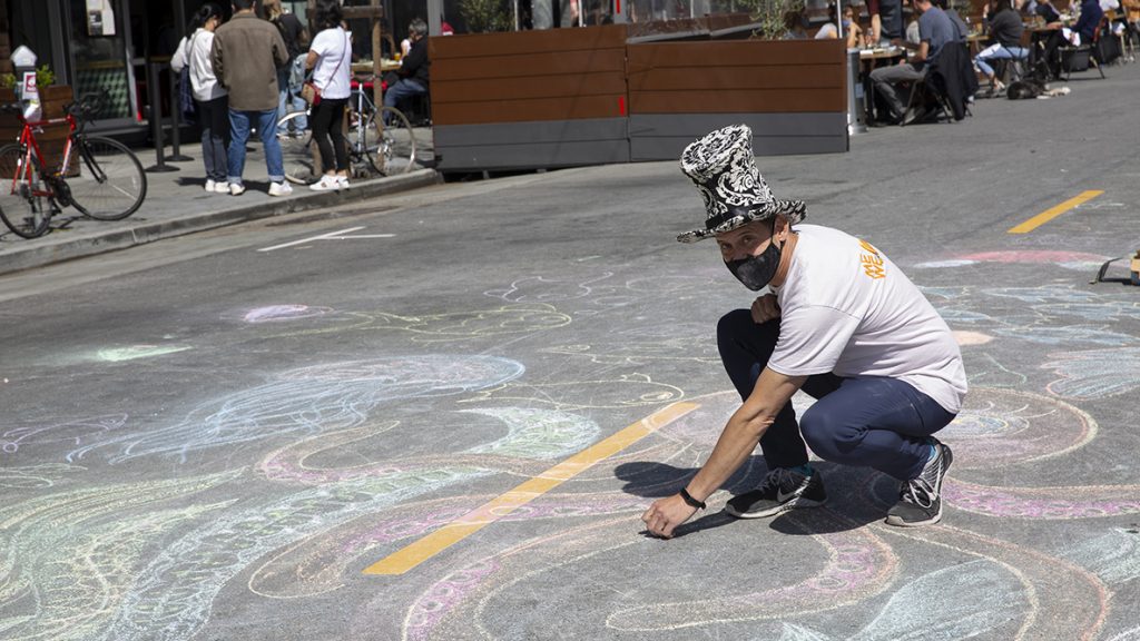 Todd Young, aka the GateGuySF, holding his chalk creating arts with