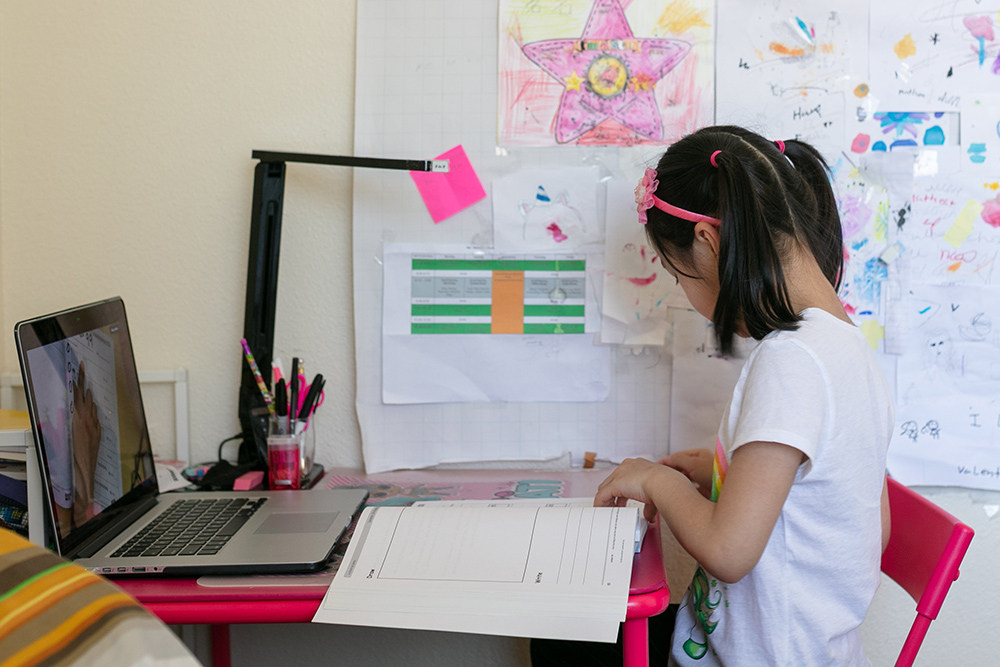 Mathea is learning on Zoom in the afternoon. “She is easily distracted by everything around her,