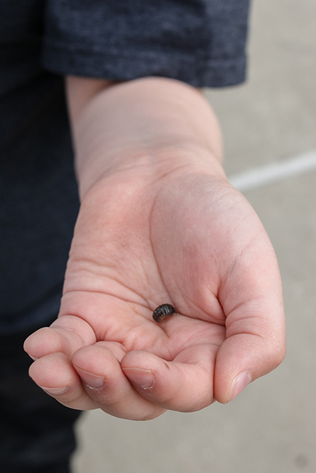 Ricardo is a second-grade student at Ruby Bridges Elementary School. He picks up a rollie pollie